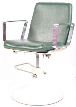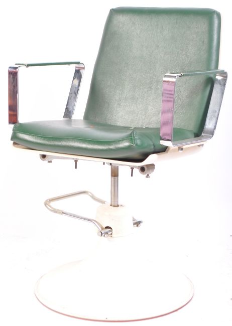 A retro vintage 20th Century industrial / medical doctor's examination chair / swivel armchair having a green leather upholstered cushioned back and seatrest. Chrome shaped armrests with all being raised on white metal tulip circular base with foot pump action lever. Measures approx 100cm x 57cm x 51cm.