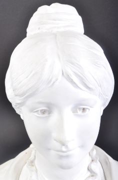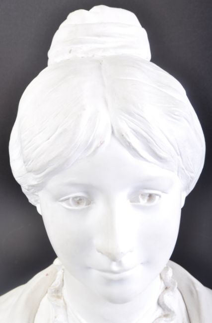 A vintage early to mid 20th Century plaster bust of a lady believed to be an original French shop haberdashery advertising piece. The bust of the maiden raised on pedestal base with Mireille notation to front. Measures approx 66cm.