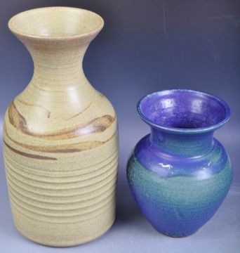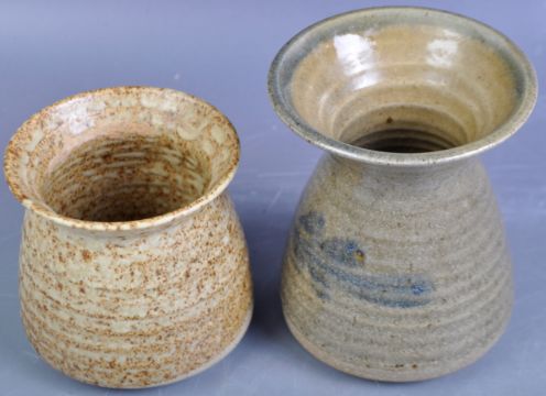 A collection of 8x pieces of vintage 20th Century British studio art pottery to include a blue / green glazed vase by Pierre Braysford, ribbed vase by David Prichard for Edinbane Pottery, black & yellow glazed tray stamped PAT, a ' Polo ' shaped vase, small tray signed to bottom ' Aldermaston Ladies Night 1969, and three other vases. (8)