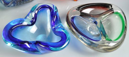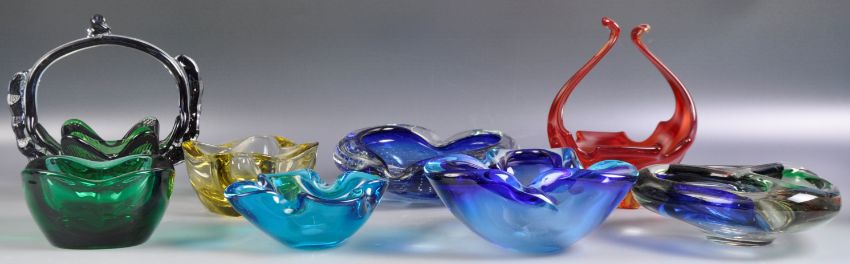 A collection of assorted studio art glass bowls to include  Whitefriars 9564 control bubble heart shaped bowl, Murano tri form coloured three section bowl, Murano baskets in red & green and other lobed example. Measures approx; 18cm largest.