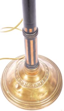 A vintage 20th Century ecclesiastical free standing brass and ebony lamp light having a brass oil light top with removable section reveal a hollow interior. Oval panel decoration interspersed with embossed Art Nouveau detailing. Raised on an ebonised cylindrical column upon a circular stepped brass base. Converted to electric. Measures approx 82cm x 23cm diameter.