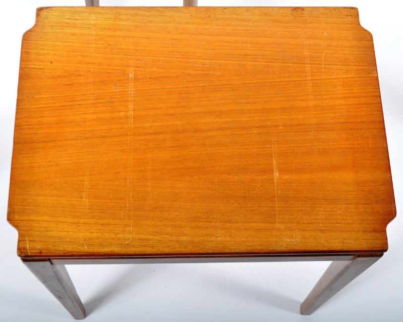 A set of retro vintage 20th Century Danish inspired teak wood set of three nesting tables. The nest of tables / side occasional tables of simple rectangular form with shaped tops supported on angular tapering legs. Measures approx 49cm x 65cm x 38cm. Slight repair to one leg.