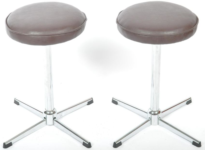 A matching pair of retro vintage 20th Century stools having faux brown leather padded circular tops raised on single chrome steams upon four point star base. Each measures approx 49cm x 50cm diameter.