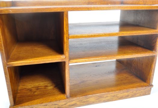 A vintage early - mid 20th Century oak industrial sideboard credenza storage unit having a gallery surround to with a series of shelves / pigeon hole compartment raised on plinth base. Measures approx; 56cm x 80cm x 42cm.