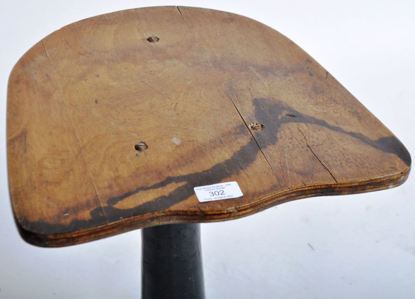 Singer - An original retro vintage industrial early 20th Century cast iron based adjustable swivel factory work machinist stool chair having a shaped saddle oak seat raised on the cast iron quadruped base. Ebonised finish and stamped ' Singer '. Measures approx; 46cm x 34cm x 37cm.