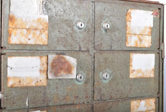 A matching pair of retro vintage mid 20th Century industrial metal locking pigeon hole locker cabinets each of upright inverted tapering pedestal form form. Each having twenty locking pigeon hole locking door sections with the whole front acting a single door opening to reveal a section interior. Raised on shaped angular feet. Measures approx 168cm x 55cm x 55cm.