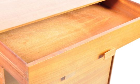 IB Kofod Larsen - G Plan - Danish Range - An original retro vintage 1960's teak wood chest of drawers. The bank six graduating drawers having split square pull handles all raised on tapering cylindrical legs united by stretcher. Stamped to drawer. Measures approx; 107cm x 77cm x 46cm.