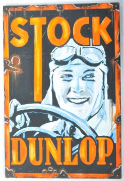 Stock Dunlop - A 20th Century oil on canvas painting artist's impression of a traditional vintage advertising enamel sign. Of motoring interest - Stock Dunlop tyres - Large orange font depicting a classic British racing driver with helmet and goggles on a black background. Measures approx. H76cm x 51cm