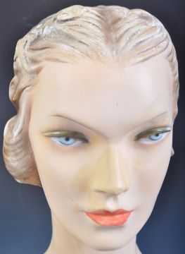 An original retro vintage early 20th Century 1930's Art Deco advertising point of sale shop display haberdashery millinery plaster female mannequin head bust having brushed back curls with delicate painted features, red lips, blue eyes with raised Art Deco design shoulders. Makers stamp and design number to verso. Measures approx; 48cm tall.