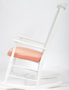 A retro vintage 1960's Danish beech and elm wood rocking chair having a shaped bar top with turned spindle back rest, shaped arms and cushioned seat. All raised on cylindrical supports with bow rockers.