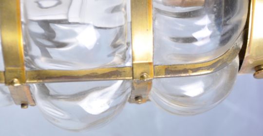 A mid 20th Century glass hanging porch lantern having a segmented glass body with gilt metal case. Complete with hanging hook to top. Measures approx; 28cm long.