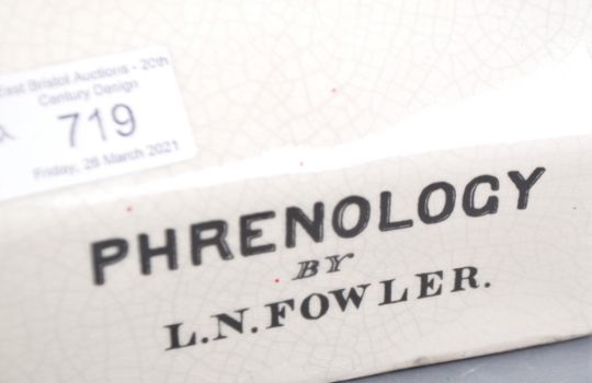 A reproduction Victorian ceramic Phrenology head and hand with each having a crackle glaze finish with black lettered sectional labels, the base reading Phrenology by L. N. Fowler to the head. Head measures approx 30cm x 14cm x 11cm.