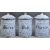 A set of three retro vintage 20th Century French kitchen enamel tin storage containers / jars in a speckled blue enamel. Each with bold notation and lids. Measures approx; 18cm tall.