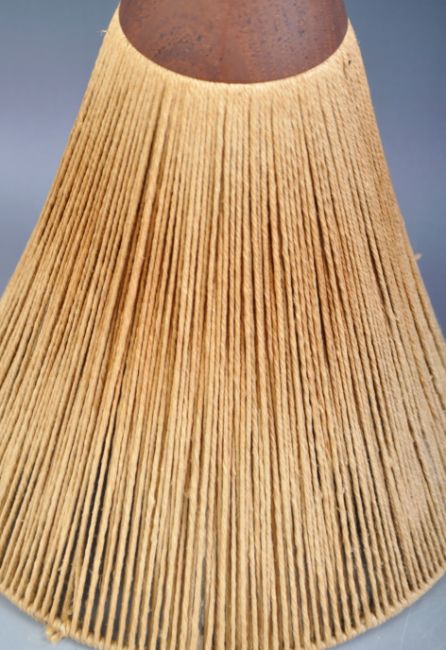 A good retro vintage mid 20th Century Danish Scandinavian wall hanging lamp light / wall sconce of stylish design. The lamp of teak wood construction having a protruding arm supporting the drop down conical pendant sisal shade. Measures approx 45cm x 43cm.