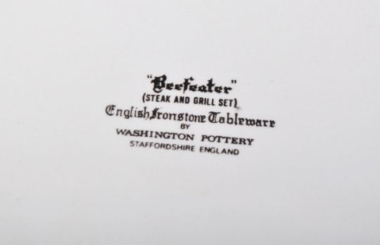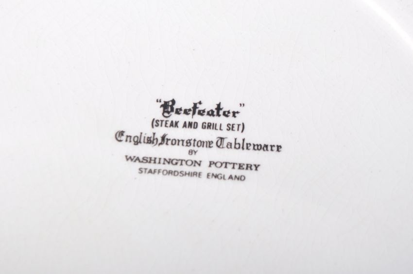 Washington pottery - Staffordshire English Ironstone - A 1970's retro set of six vintage tableware dinner Beefeater ' Steak & Grill ' cow ' pattern plates depicting a wooly cow bull in psychedelic pink. Measures 24cm x 28cm.