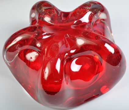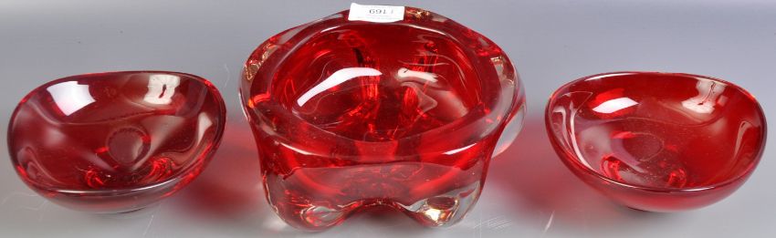 Geoffrey Baxter - Whitefriars - A group of original retro vintage British studio art glass bowls in Ruby red comprising a large 19cm 9625 five lobed bowl and a pair of 9516 Tricorn bowls.  Largest measures 19cm wide.