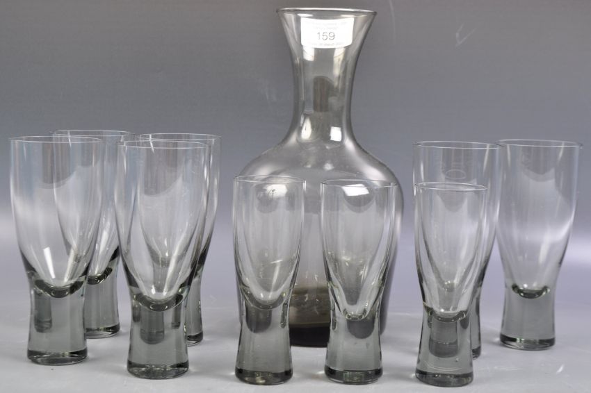 Per Lutken - Holmegaard - A retro vintage 20th Century studio art glass smoked glass carafe decanter bottle and glass set. Comprises a tall carafe with club shaped bowl and tapering flared neck along with a set of six heavy based drinks glasses with three smaller measures. Measures approx; 22cm tall
