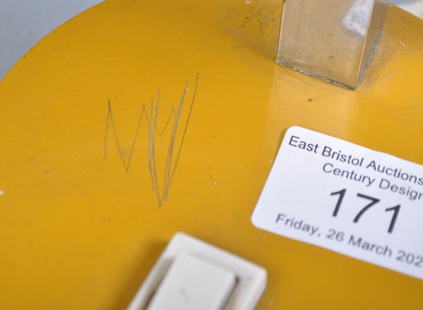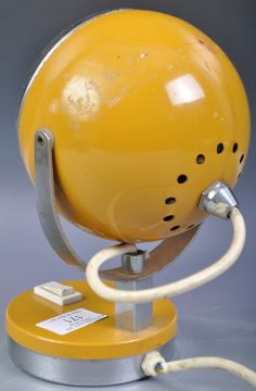 An original retro vintage 1960's Italian designer Eyeball / Eye Ball shape work desk lamp in a mustard yellow enamel finish with chrome mounts set to a circular two part base with flick switch. Measures approx; 20cm tall.