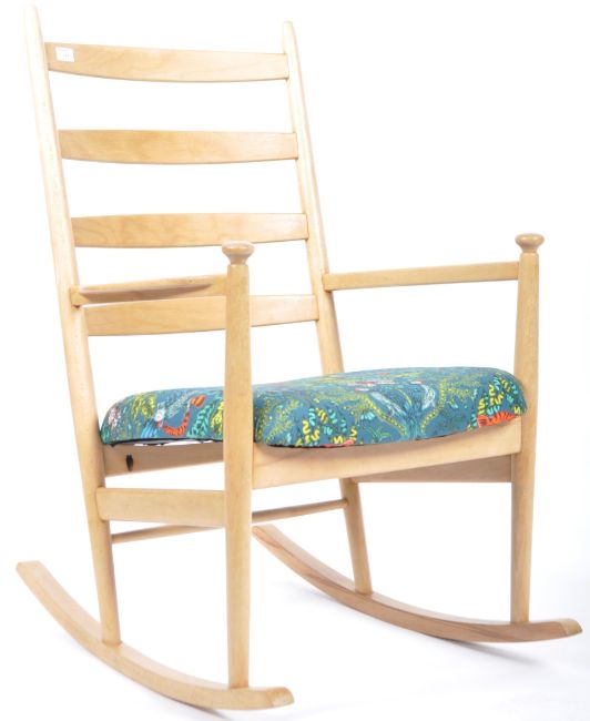 Niels Eilersen - A retro vintage 1960's Danish beech and elm rocking chair having a vibrant Emma Shipley Amazon print fabric. Fully restored beech and bent ply frame with ladder back, shaped arms and sleigh bow rockers. Measures approx; 100cm x 62cm x 60cm.