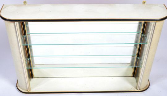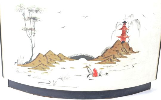 A retro vintage mid 20th Century cocktail bar of curved form complete with the rare wall mounted mirrored glass shelf. Decorated in a white pearlescent melamine with Chinoiserie scenes of a temple and rocky outcrop, Measures approx; 107cm x 128cm x 102cm.