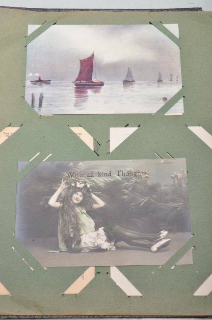 A collection of antique Edwardian early 20th century postcards held within a slot-in type album. The postcards spanning a variety of design: children, boats, animals, artwork, as well as geographical subjects such as Dorset, Cornwall, Bristol, Liverpool, London, Plymouth, Weston Super Mare and Weymouth.