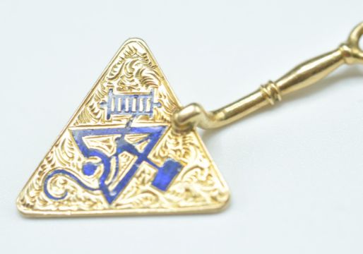 A 19th Century Victorian 18ct gold Masonic trowel charm pendant having engraved decoration throughout with an enamelled square and compasses symbol to the centre. Marked 18k to the bale. Weight 2.6g.