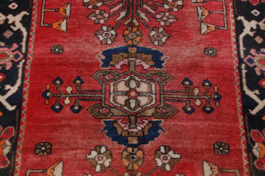 A mid century Middle Eastern Persian Lilihan hand woven carpet rug having floral medallion to the centre, mirror floral medallions to the top end and bottom end on a red field, black main border with repetitive decorations and red pile directions.