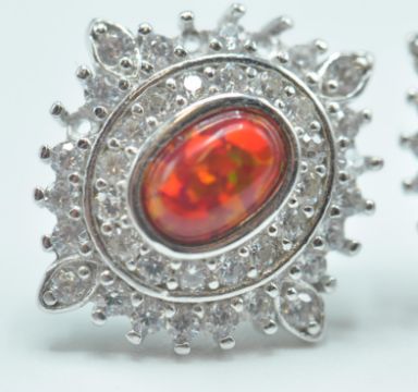 A pair of silver, CZ & opalite earrings having a red central stone set within two rows of white stones. Measures 16cm.