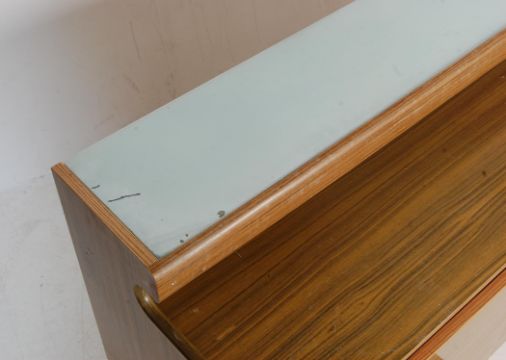 A vintage 1980’s melamine dressing table having a suspended shelf atop having milk glass / white grass top, fitted electric lights, bank of six drawers to the front with geometric wooden handles, raised on shaped supports united by stretchers.