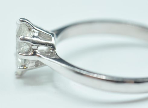 An 18ct white gold & pear shaped diamond ladies ring of approx 75 points. Size N. Stone size 10mm. Tests indicate 18ct gold.