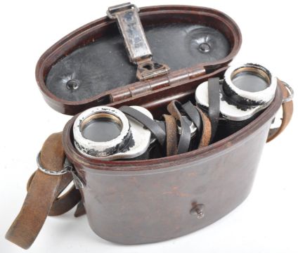 A pair of WWII Second World War Third Reich Nazi German Dienstglas field binoculars. The binoculars being 6x30 magnification with serial number 43368 engraved to eyepiece. Optics good, but with some visible dirt. Housed in their original Bakelite carry case, with maker's marks to front. Rare pair of binoculars.