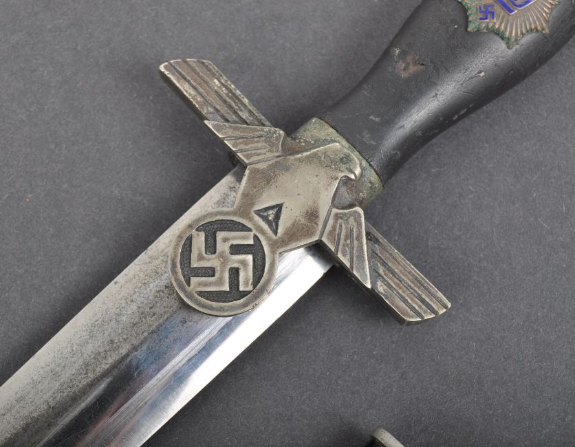 A rare WWII Second World War Third Reich Nazi German RLB ( Reichsluftshutzbund ) German Air Protection Service officers uniform dagger. The dagger having a flat pommel and ebonised wooden grip with the regimental badge. The cross guard being the wings of a German eagle atop a Swastika. The double edged blade stamped to the ricasso for SMF Solingen housed in a black steel scabbard. The attached leather frog with RZM mark to the clip. Measures approx 37cm.