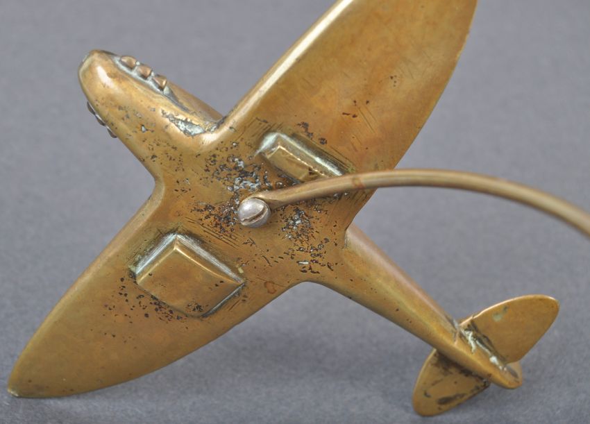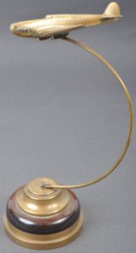 A WWII Second World War interest desktop brass model of an RAF Royal Air Force Hawker Hurricane fighter plane. The model mounted on a curved brass arm, and further mounted on a turned wooden base with brass embellishments. Measures approx; 24cm tall.