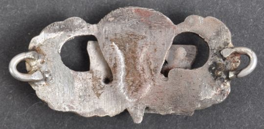 A WWII Second World War type US United States Army Parachutist / Jump Wings badge from the Engineer branch. The white metal badge likely once being part of a bracelet depicting a parachute and splayed wings flanked by a triple turreted castle. Interesting item.
