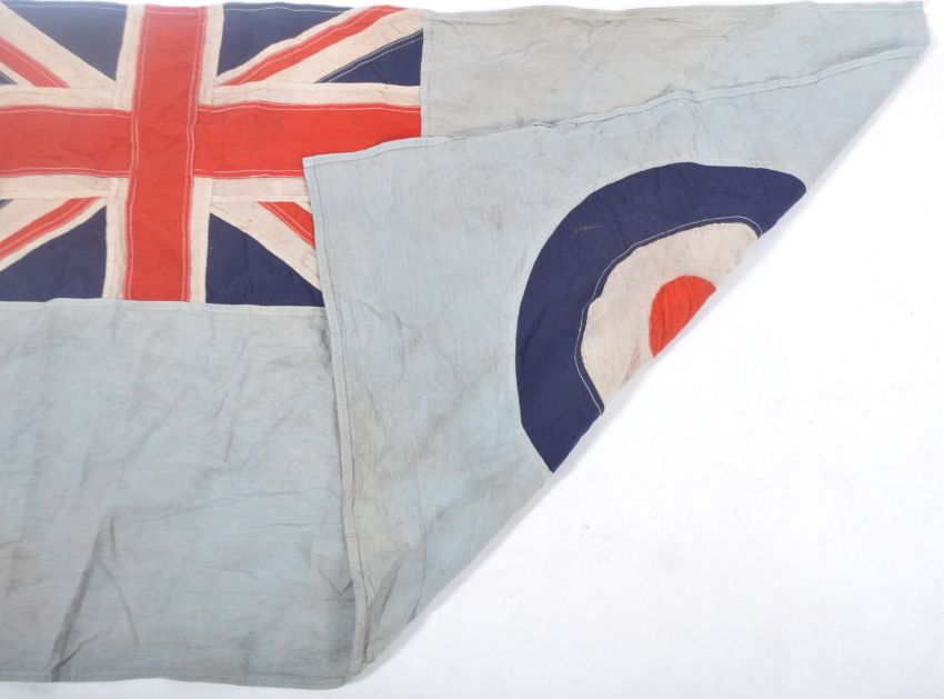 An original vintage WWII Second World War period RAF Royal Air Force airfield / building flag / ensign. Typical form, with blue ground, RAF Roundel to end and Union Flag to corner. The seam erroneously stamped with ' RAF Gibraltar ' and dated 1943. Exact age or provenance is unknown, but the flag is likely a genuine period example, with later markings. Measures approx; 64cm x 99cm.