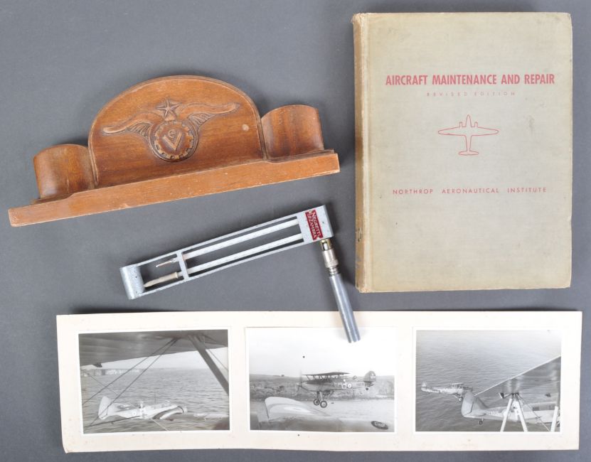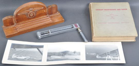 A collection of assorted WWII Second World War period (and other) Aviation / RAF / USAAF interest items to include; a Negretti & Zambra temperature gauging set (possibly for oil?), a decorative desktop pen stand with carved wings motif, ' Aircraft Maintenance And Repair ' manual, photographs and other items.