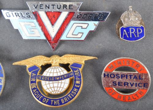 A collection of assorted enamel badges, some WWII Second World War related, to include; Girls Venture Corps, ARP Lapel badge, ' Hepworth & Grandage Ltd ', Air League Of The British Empire, Civil Defence Instructor, UTP (Upper Thames Patrol), RAF Comforts Committee etc. Interesting assortment.