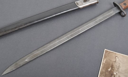 Lance Corporal William Albert Warren of the 2/4th Battalion, Devonshire Regiment - Warren's original 1907 pattern Wilkinson made rifle bayonet. Regimentally marked to the pommel ' T 4DVN 420 ' (for Territorial 1/4th Battalion Devonshire Regiment). The bayonet of typical form with hooked pommel, carved walnut grips, hooped quillon, the ricasso marked Wilkinson, and dated 1907 with GR cipher. Other official stampings to other side. Housed in its original leather and steel scabbard. Generally in excellent original used condition. Supplied with a period picture postcard photograph of Warren in uniform, taken at Lyme Regis. Rare to see a bayonet with such provenance.