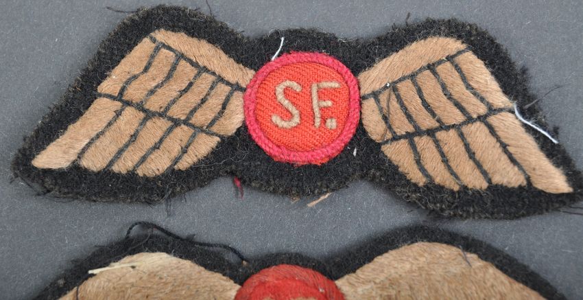 A collection of x3 WWII Second World War type / related American OSS (Office of Strategic Services) uniform patches. All three being ' Wings ' with ' SF ' to centre. Provenance unknown.