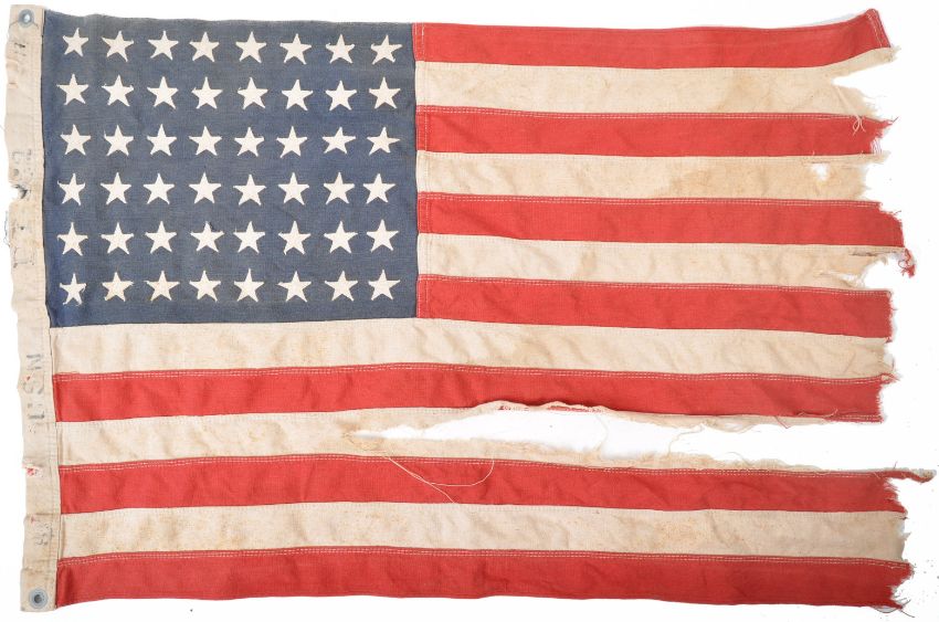 An original WWII Second World War period US United States Army / Navy wartime flag, believed to be from an American Torpedo Patrol Boat. The flag of typical form, with individually stitched stars (48). The seam marked ' TP 452 ' and stamped ' 44 ' (presumably the date of 1944). With nickel grommets to either end. The flag worn, and generally AF - history is unknown, but an interesting period flag nonetheless. Measures approx; 59cm x 84cm.