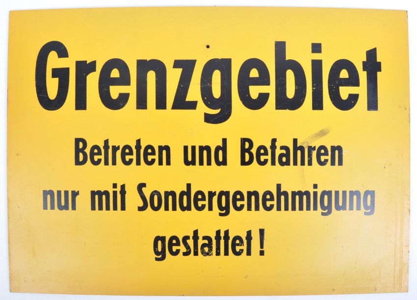 ' Entering and driving on the border area is only permitted with a special permit '. Similar signs used at Checkpoint Charlie in Berlin. Measures approx; 42cm x 59cm.