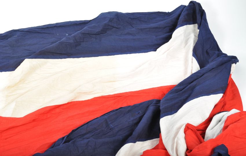 A pair of large vintage WWII Second World War period believed VE Day (or similar) celebration banners. Both in red, white and blue, and each approx; 7m long. Ideal for shop displays, or re-enactments. Unusual items.