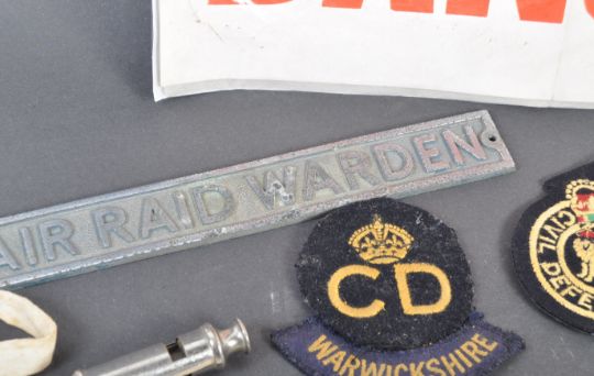 A collection of assorted WWII Second World War related ARP Air Raid Precautions items, to include; a rare original period LMS Railway Train ' Air Raid Precaution - DANGER ' paper sign in red and white, an original set of ' Anti Gas Eyeshields ', various armbands and patches, a small metal sign and a whistle. Interesting collection.