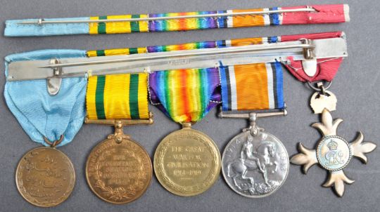 A WWI First and WWII Second World War interest medal group belonging to one Captain Frank J. Harris of the Somerset Light Infantry. The medal group comprising; his Order of the British Empire (OBE), War Medal (impressed Capt F. J. Harris), Victory Medal with oak leaf for a mention in dispatches (impressed ditto), his Territorial War Medal (impressed Capt F. J. Harris Som. L. I.) and another of overseas origin. All mounted on bar, each with original ribbon. Also includes the official set of miniatures, with an additional Delhi Durbar Medal, Territorial Decoration miniature. Along with the original OBE medal box, and the original letter of recommendation 'The King, on recommendation of the Secretary Of State For Foreign Affairs, has been pleased to direct that you should be appointed an Officer of the Order Of The British Empire' and is dated 1942. Little is known of the history of Captain Harris, only that at the outbreak of the First World War he was a bank manager at the Ottoman Bank, based in Baghdad, Iraq. Consigned from the family (Harris was the vendor's Grandmother's brother. It is believed the 'J' stands for James.) An interesting medal group.