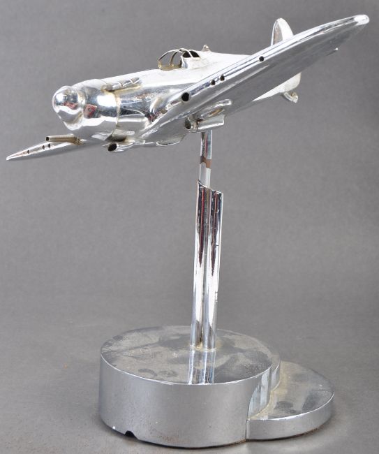 An impressive large WWII Second World War related mid-century Art Deco style chrome statue of a Hawker Hurricane fighter aeroplane. Large scale model, mounted atop a heavy three-stepped circular base. The model well detailed with cockpit and even the trailing wheel (now sadly lacking some of the smaller details). Very likely from the factory, or a director's office. Measures approx; 30cm tall.
