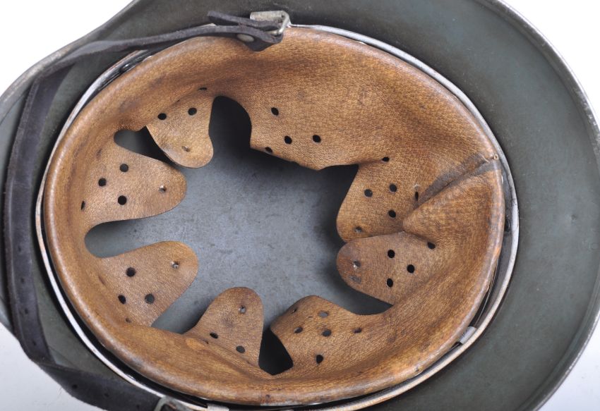 An original WWII Second World War Third Reich Nazi German Labour Service M35 steel combat Stahlhelm. The helmet being a single decal example with the Reich Labour Service ( Reichsarbeitsdienst ) emblem to the left side depicting eagle atop a Swastika. Retaining the original 8 tongue pig skin liner and black leather chin strap. Impressed to the rim 9644 along with manufacturer code ET58 for makers