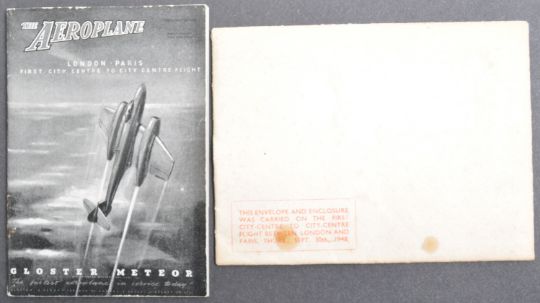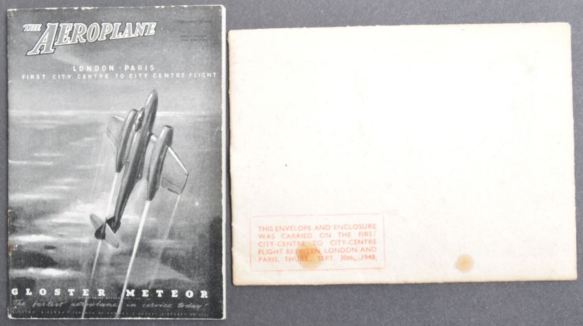 Aviation History - an original miniature copy of ' The Aeroplane ' magazine and accompanying envelope, both carried on the first city-centre to city-centre between London and Paris, September 30th 1948 by the Gloster Meteor plane, which is detailed in the miniature magazine. Interesting item. Magazine measures approx; 10cm.