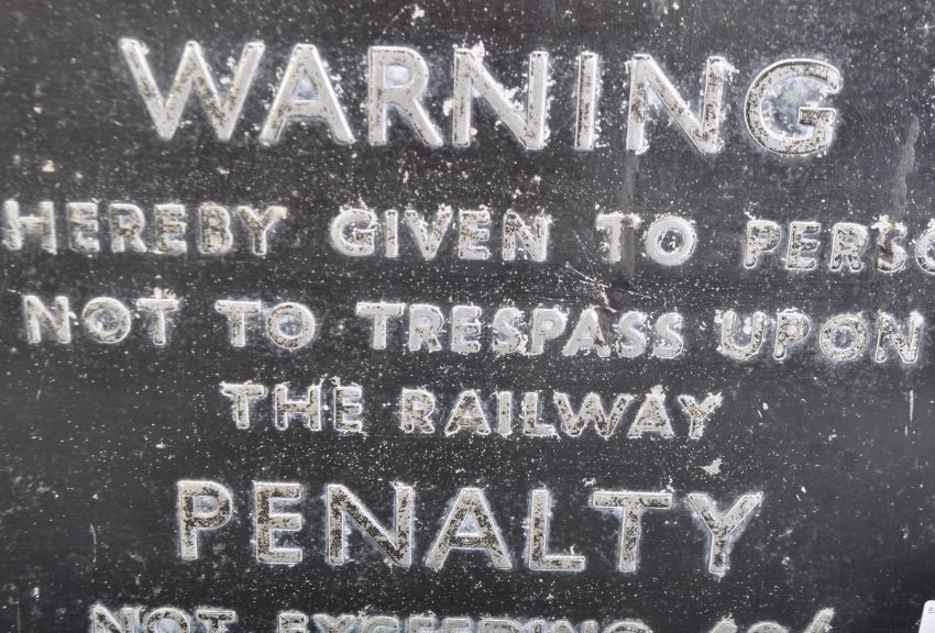 A retro vintage 1960's railway train locomotive pressed metal enamel sign for the British Transport Commission reading' Warning Is Hereby Given To Persons Not To Trespass Upon The Railway Penalty Not Exceeding 40/- '. Black ground with raised lettering and four fixing holes to corners. Measures approx; 31cm x 38cm.