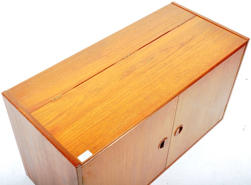 Hansen & Guldborg - HG Furniture - A good retro vintage 20th Century Danish Scandinavian teak wood modular wall hanging media / storage cupboard. The unit having a quarter hinged lid top with double doors below opening to reveal a shelved interior. The doors having recessed circular handles with central straight grips. The cupboard having the original wall mounting metal bracket. Marks to verso. Measures approx 50cm x 89.5cm x 40cm.