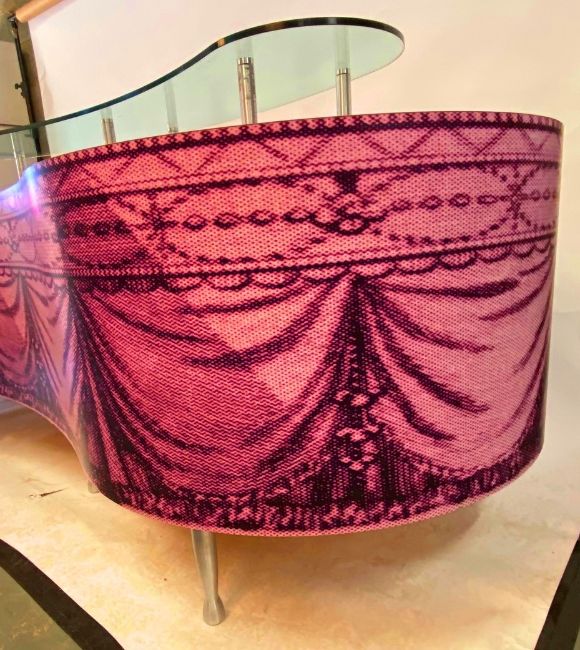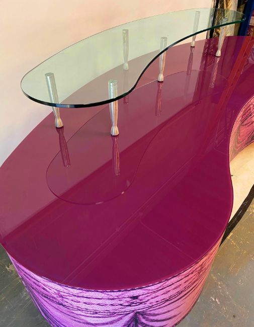 A large pair of contemporary quality laminated Hollywood Regency shop haberdashery display advertising point of sale / event stands of large bean shape. The display units having a thick applied pink laminate with scroll and floral decoration atop and curtains detailing running round the sides. Removable pink cut glass panel atop with a further thick glass bean shaped shelf raised on polished metal legs sitting on top. All being raised on screw polished metal feet. Base measures approx 78cm x 281cm x 95cm.